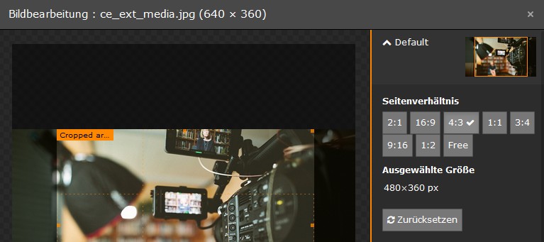Zur Festlegung der Bildausschnitte steht ein komfortabler Editor zur Verfügung. Die Bildgrössen werden in den meisten Fällen automatisch angepasst. Unter gewissen Umständen müssen sie jedoch manuell über die Auswahl von Varianten und Definition einer Skalierung definiert werden.